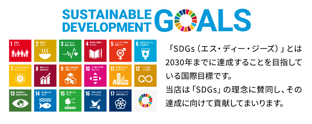 当店でも社会的責任を果たすべく、「世界を変えるための持続可能な開発の為の国際目標~SDGs」への取り組みを様々行ってまいります。